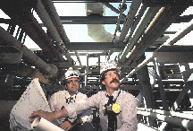 PWA CADD Designer field verifying location and requirements for new pipe support and rack system for Hooker Chemical's chlorine plant in Tacoma, WA. PWA has designed many racking and support systems for mechanical equipment and piping.